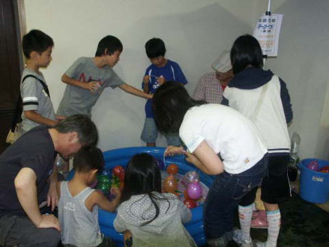台風の影響で屋内で縁日コーナーが催されました。雨にもかかわらず大勢の子どもたちでにぎわいました。