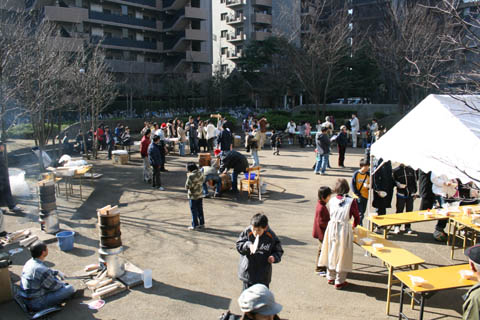 暖かな日差しの中、大勢の参加者が餅つき会を楽しみました。