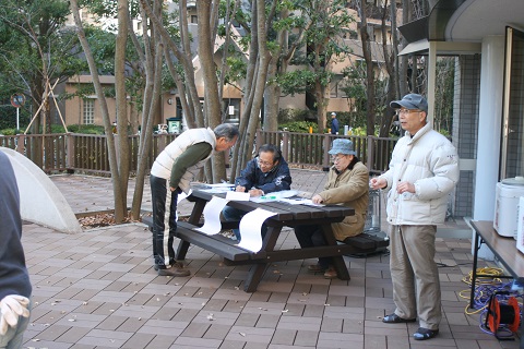 完成したばかりのウッドデッキで、受付が始まりました。ちょっと日陰なので寒いので、ご苦労様です。