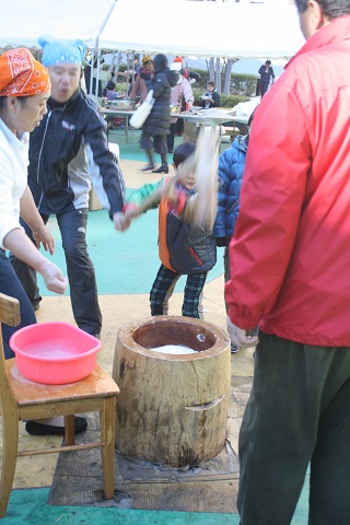 ちびっ子たちももちつきをしました。重い杵をものともせず、頑張ってついてくれました。